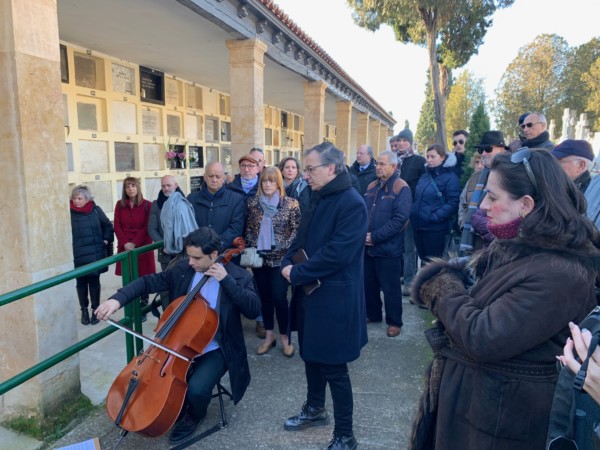 [dropcap]M[/dropcap]iguel Elías, con su voz y su palabra, y Pedro Garriga, con su violonchelo, fueron los encargados de recordar a Miguel de Unamuno en el homenaje que cada 31 de diciembre organiza la Asociación de Memoria y Justicia de Salamanca en el cementerio San Carlos Borromeo