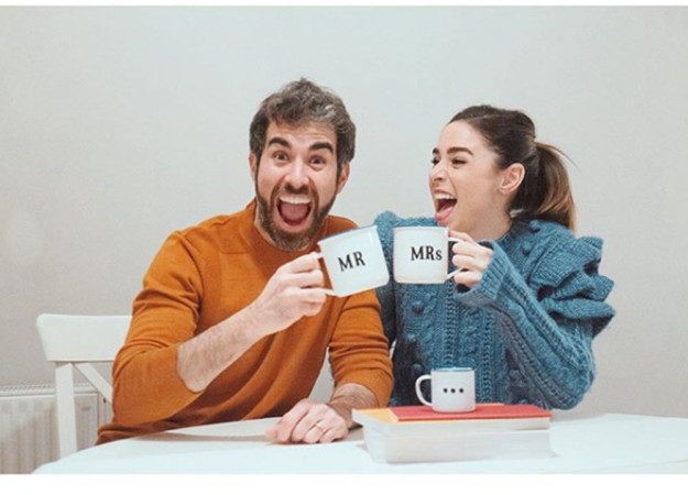 La pareja compartió una foto en la que se les ve brindando con dos jarras y una pequeña. Acompañaron la imagen con este texto: Cigüeñas a nosotros.