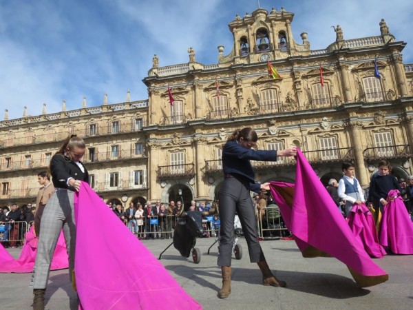 Y el PP, desde la Diputación Provincial, que a falta de otros servicios para los pueblos regenta una escuela de toreros, organizó una sesión de toreo de salón en la Plaza Mayor que fue atrayendo la atención de los salmantinos y turistas que a mediodía (hora punta) pasaban por el ágora salmantino y se iban agolpando entorno al vallado que delimitaba un coso taurino improvisado en el piso dela Plaza.