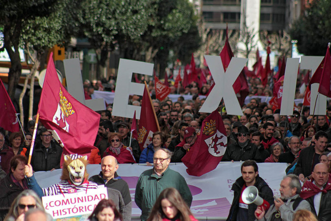 Elena F. Gordón. ICAL. Una caravana de taxistas precedió al inicio de una marcha acompañada en todo momento por el ‘Himno a León’ y numerosas pancartas; la más grande con la palabra ‘Lexit’ en alusión a la corriente que reclama la autonomía número 18 para las provincias del antiguo Reino de León. La marcha discurrió con normalidad por las calles del centro de la ciudad y llegó a la plaza de San Marcelo, donde intervinieron representantes de las organizaciones convocantes para agradecer la participación y plantear mensajes reivindicativos.
