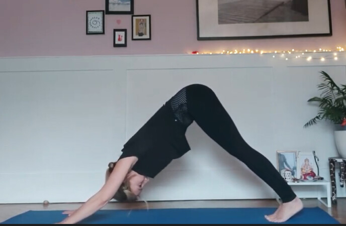 Adho mukha svanasana: postura del perro boca abajo. Dibuja una V invertida con tu cuerpo. Cabeza y cuello relajado, abriendo el pecho hacia la tierra. Abre bien tus hombros. Queremos alargar la espalda. Flexiona tus rodillas si lo necesitas. Exhala.