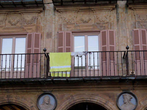 En los balcones del ágora capitalina es frecuente ver banderas de España o estandartes de las cofradías. Nada que ver con lo que se ha visto este viernes por la tarde, una toalla, un bikini y un bañador colgando de uno de los balcones de la Plaza Mayor.