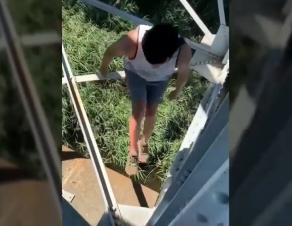 Caminan por las vías del puente Pradillo del tren mientras se graban los píes y bajo ellos el agua del río Tormes