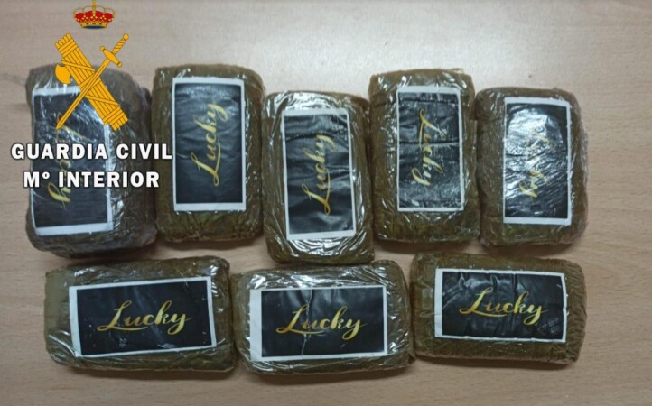 Como consecuencia de la actitud de los citados ocupantes, los agentes procedieron a la inspección de las pertenencias, localizando 8 tabletas de hachís en los bolsos de dos de ellos, con un peso total aproximado de 800 gramos.