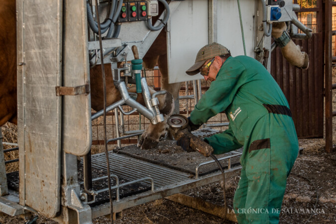 En el conjunto de Castilla y León no hay muchos profesionales que se dediquen a eliminar cualquier problema en el tren inferior de los animales, con solo dos en Salamanca. “Trabajo no nos falta, mucho fuera de Salamanca. No sé si es por buena fama o porque trabajo bien, pero hay ganaderos que me llaman de muchos sitios para que vaya a sus explotaciones. Suelo moverme de León hasta Badajoz”.