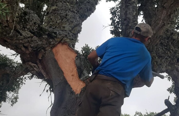 Como cada año por estas fechas, cuadrillas de andaluces vienen a ‘desvestir’ a los alcornoques de Valdelosa y los pueblos linderos. “Nosotros tenemos unas 6.000 hectáreas, pero en la zona habrá como unas 12.000 de alcornoques”, matiza Prada.