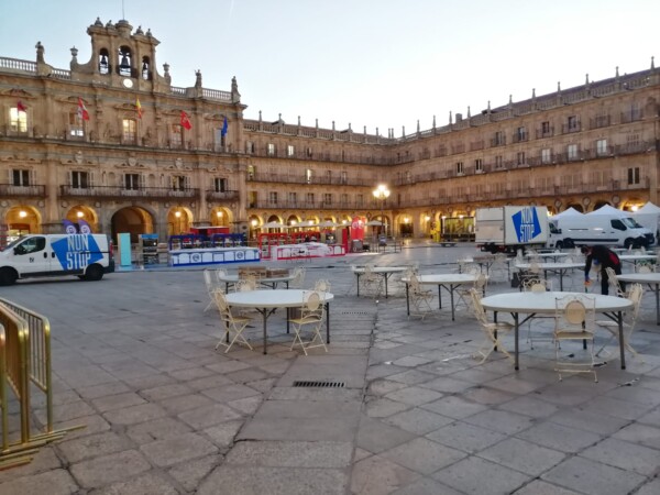 Ya están instaladas las cocinas, donde demostrarán las dotes culinarias los concursantes, así como las mesas y sillas, donde servirán los platos cocinados teniendo como inmenso comedor la Plaza Mayor de Salamanca.