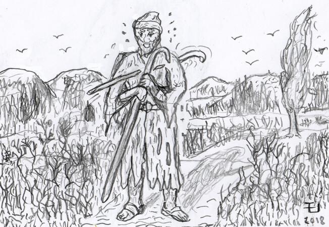 Y sin esperar más, estando aún lejos del pobre, le arrojó la vara con todas sus fuerzas.