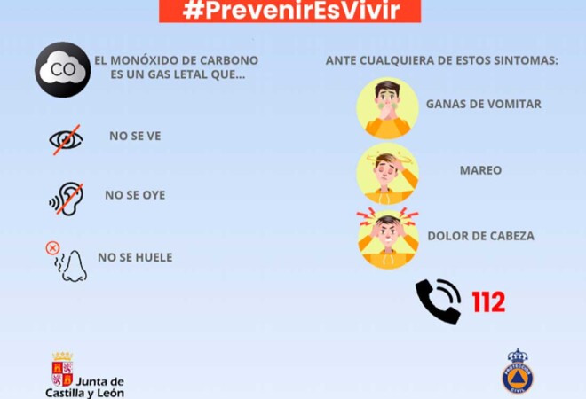 Ante la imposibilidad de percibir el monóxido con los sentidos, es muy importante conocer los síntomas que delatan que se está sufriendo una intoxicación por monóxido de carbono, como son la aparición súbita de dolor de cabeza de intensidad progresiva, mareos, desorientación, náuseas, dolor general e incluso desvanecimientos, y en el caso de presentar cualquiera de ellos, es recomendable contactar rápidamente con el Servicio de Emergencias 1-1-2.