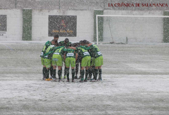 El partido corresponde a la jornada 15 del Subgrupo IA de Segunda B y ha dejado imágenes como éstas bajo una intensa nevada en tierras salmantinas: