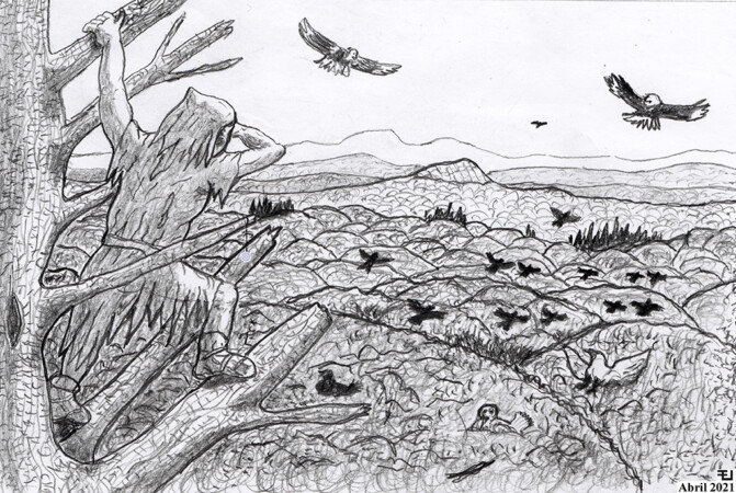 A menudo los hombres salían del recinto espinoso –previo examen desde lo alto de la Peña Meser, por si acaso– para cazar. A veces se acercaban cautelosamente al río, cerca de unas fuentes de agua caliente, y pescaban. Las mujeres recolectaban hierbas, pero no podían competir con la experiencia de Elvira, que, por ello, se ganó la confianza y el aprecio de todos. Por ello y por el cariño con que trataba a los niños, jugando, contándoles cuentos…