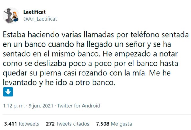 «Unos minutos después ha venido y se ha vuelto a sentar a mi lado, esta vez con la mano extendida sobre el banco a pocos centímetros de mi. Me he disculpado con la persona con la que estaba hablando y le he dicho «perdone, ¿quiere algo? y él «no no, es que aquí da la sombra«.