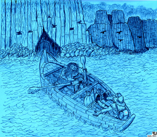 Cabizbajo y meditabundo, Cintolo salió de aquella aldea y así atravesó otras, en montañas y valles, andando y andando. Hasta que, ¡al fin!, presintió que estaba llegando a una boca del infierno, oscura y tenebrosa. Pero se hallaba al pie de un acantilado, al otro lado de un cenagoso río, tan ancho que parecía un lago. Temiendo que fuese el Lethes, donde olvidaría todo, o el Aqueronte, vio venir una barca que quería llegar hasta él. Con mucho esfuerzo, lo consiguió.