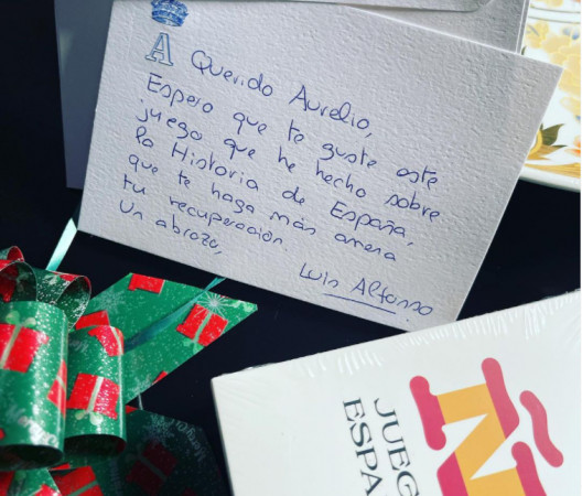 El periodista Aurelio Manzano está convaleciente de un accidente de tráfico que sufrió hace unos días, entre las personas que lo han visitado, Luis Alfonso de Borbón que le ha llevado el trivial ‘Ñ de España’. «Sigo recuperándome. Y mientras, mi amigo, Luis Alfonso de Borbón me ha traído en persona este juego de cartas que él mismo diseño. De esta manera, no solo aprendes cosas nuevas, sino que también te distraes. Gracias, querido».