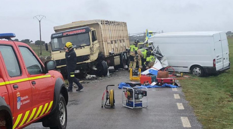 El centro de emergencias 1-1-2 Castilla y León recibió una llamada a las 11.16 horas que informaba de una colisión entre una furgoneta y un camión en el kilómetro 14 de la DSA-418, en Sando, dirección Aldehuela de la Bóveda, donde habían resultado heridos los dos ocupantes de la furgoneta y se encontraban atrapados en el interior del vehículo.