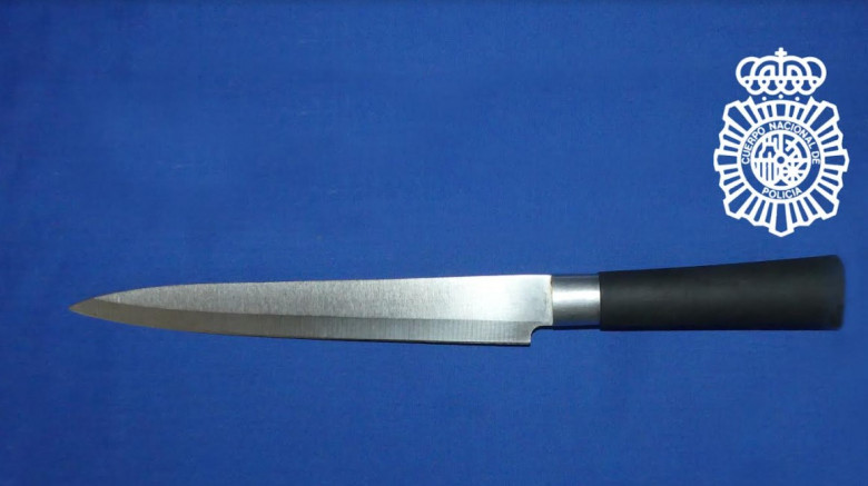 Al alcanzar el rellano de la primera planta, del interior de una de las viviendas salen dos varones, manifestando ser el hermano agresor y el hermano testigo que entrega a los Policías Nacionales un cuchillo de aproximadamente 22 cm. de hoja.