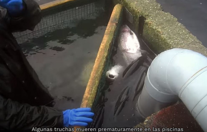 En las imágenes, también se puede observar el hacinamiento de peces en los tanques, las muertes prematuras por las condiciones de producción y el manejo inadecuado de los peces por parte del personal de las piscifactorías. En una de las piscifactorías, una trabajador informó que solo ese día habían muerto 1.823 truchas. Continuó diciendo que el día anterior hubo 1.300 bajas.