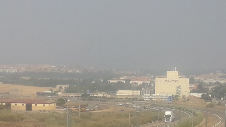 Desde el perímetro de la ciudad, como puede ser el alto del recinto ferial, se puede ver como el humo envuelve la ciudad. Los bomberos informan de que puede ser que el viento esté trayendo hacía aquí restos de ceniza y humo.