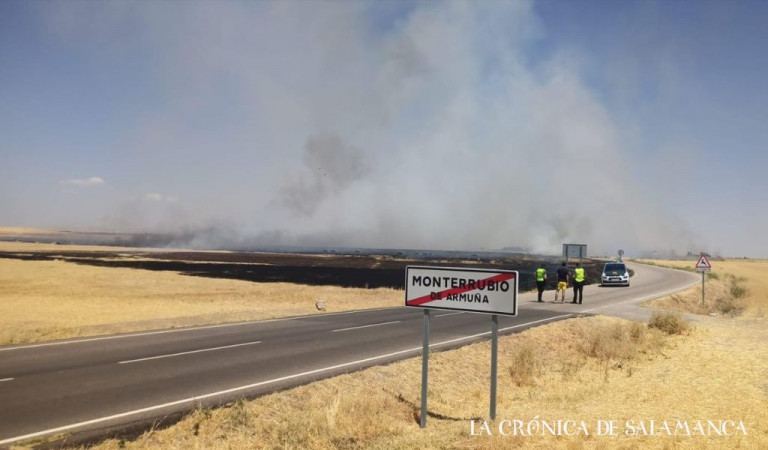El primero de ellos tuvo lugar a las 14.38 horas en una zona de cultivos de Monterrubio de la Armuña, en la carretera que comunica la localidad con San Cristóbal de la Cuesta, donde tuvieron que emplearse a fondo cuatro dotaciones de los Bomberos de la Diputación, porque el viento propagó las llamas con gran velocidad.