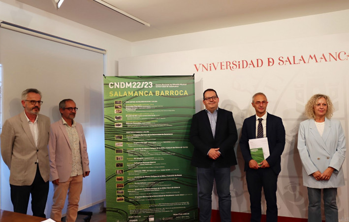 Ricardo Rivero, rector de Universidad de Salamanca, y Francisco Lorenzo, director del Centro Nacional de Difusión Musical, junto con Bernardo García-Bernalt, director de la Academia de Música Antigua de la Universidad de Salamanca y Luis Barrio, director del Servicio de Actividades Culturales, presentan la décima edición del ciclo Salamanca Barroca, una coproducción del Centro Nacional de Difusión Musical (CNDM, unidad del INAEM, del Ministerio de Cultura y Deporte) y la Universidad de Salamanca (USAL).