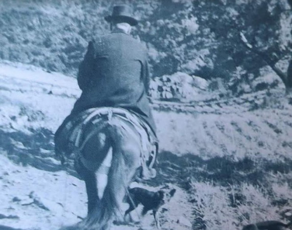 Don Filiberto Villalobos marchando a lomos de una mula, ya fuera para atender a un paciente que no se podía desplazar a su consulta, ya fuera para hacer campaña electoral pueblo a pueblo, puerta a puerta. Esta mula era su coche oficial.