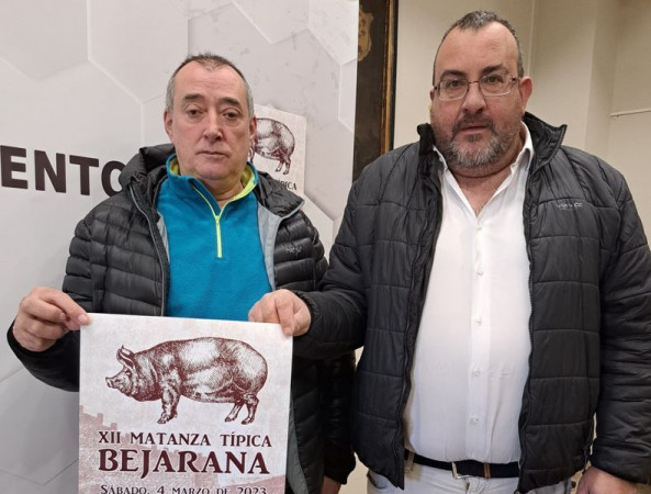 El concejal de Medio Ambiente de Béjar, José Ángel Castellano, junto con el presidente de la Peña de La Antigua han presentado la XII edición de la Matanza Típica Bejarana que se celebrará este sábado, 4 de marzo en la Puerta del Pico.