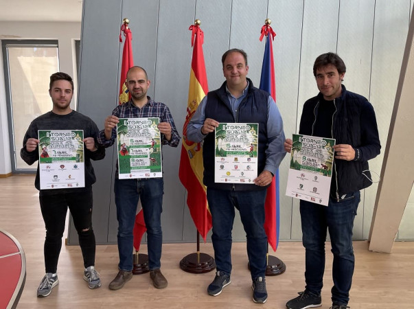 El alcalde de Guijuelo, Roberto Martín junto al concejal de Deportes, Carlos Arasa y el integrante del cuerpo técnico de la selección de Castilla y León, Pedro Martín y Emilio Sánchez, director general del C.D. Guijuelo, han presentado el evento en el Consistorio guijuelense.