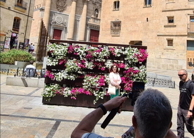 Dice que es un ‘photocall’ (el fondo que se pone parta posar ante fotógrafos y cámaras e televisión en eventos) para que los turistas posen ante las flores con el fondo de la Clerecía y la Casa de las Conchas, como si fuera una boda en un jardín de una película de la sobremesa de un sábado.
