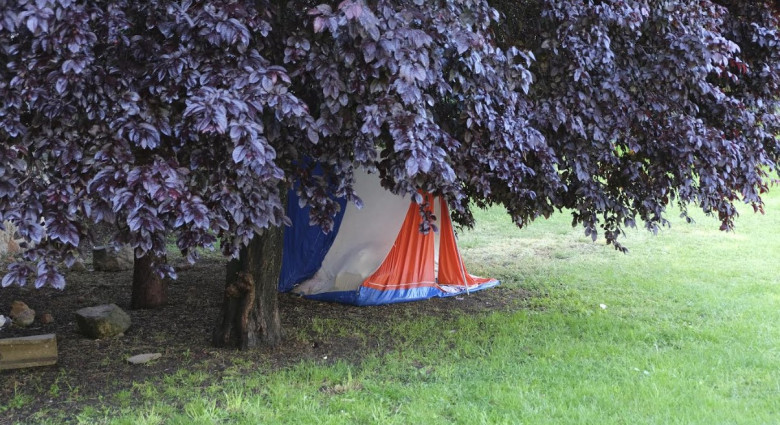 Se trata de una tienda de campaña canadiense instalada por un joven bajo uno de los árboles existentes en la zona.