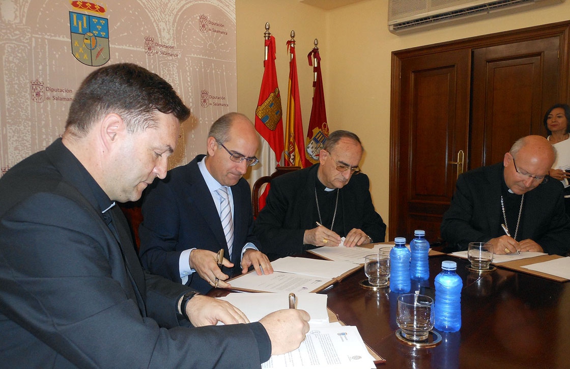 El presidente de la Diputación de Salamanca, Javier Iglesias, y los obispos de las diócesis de Salamanca, Carlos López, de Ciudad Rodrigo, Raúl Berzosa, y Plasencia, Amadeo Rodríguez, se han reunido para culminar el nuevo convenio entre las tres instituciones destinado a la restauración y reparación de iglesias y ermitas situadas en la provincia y que así lo requieran en los años 2013 y 2014.