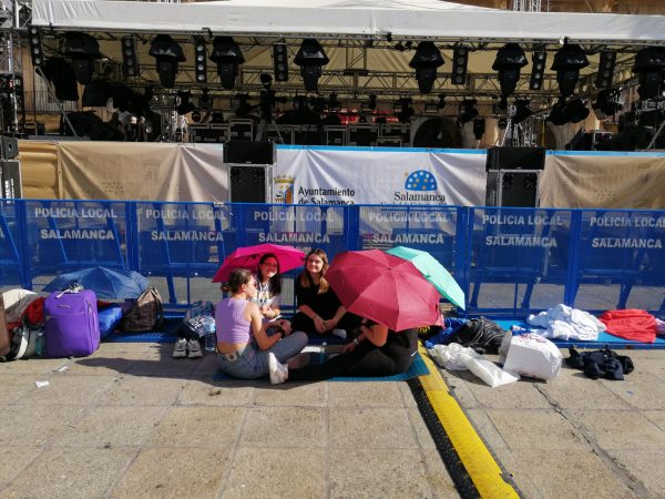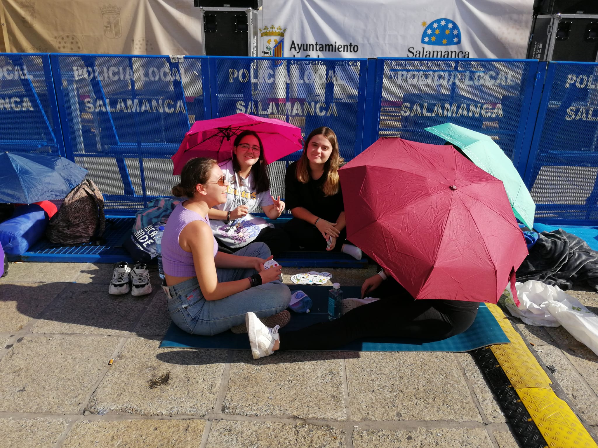 Las jóvenes hacen turnos y ‘guardia’ para que nadie les quite la privilegiada vista del escenario en la Plaza Mayor de Salamanca.