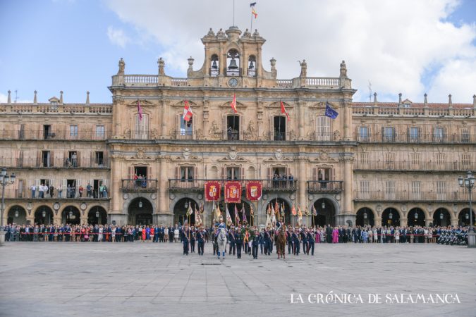 Este domingo, la Plaza Mayor se engalanó para celebrar el acto militar, donde total de 400 personas juró bandera civil que pone fin al ejercicio de la Guardia Real en la provincia de Salamanca.