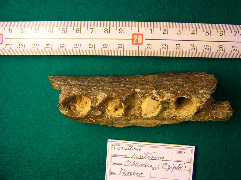 No vayas a pensar, querida amiga, que en la Sala de las Tortugas hay un cocodrilo gigante egipcio. El mejor ejemplar no es el que está fotografiado aquí. Es una gran mandíbula inferior, sin dientes. Más importante que el fósil, en sí mismo, es que está entre nosotros, en Salamanca.