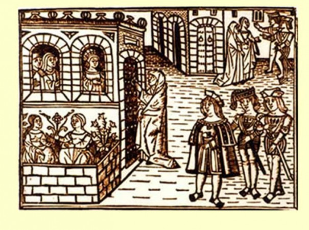 Una prostituta le roba la cartera a un joven. Lámina del siglo XVI.