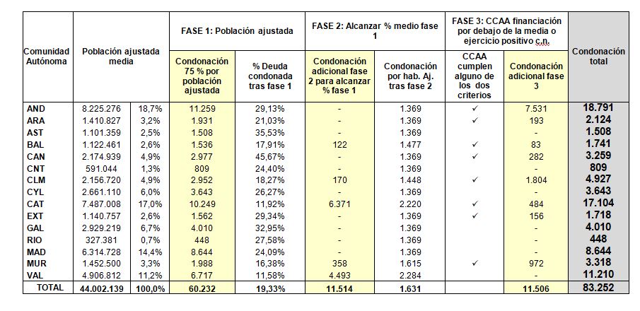 La metodología parte, precisamente, del cálculo del sobreendeudamiento. Así, se compara el crecimiento de la deuda autonómica durante la crisis financiera, es decir, entre el 31 de diciembre de 2009 y el 31 de diciembre de 2013 con el crecimiento del pasivo autonómico durante el periodo de la pandemia y el mayor impacto de la guerra de Ucrania, es decir, desde el 31 de diciembre de 2019 hasta el 31 de diciembre de 2023. En el primer periodo, la deuda aumentó en 109.582 millones y, en el segundo, en solo 29.272 millones, lo que refleja el apoyo que han recibido del Estado. El diferencial alcanza los 80.310 millones de euros y esa es la cuantía inicial a condonar. El siguiente paso es fijar el reparto entre Comunidades Autónomas.