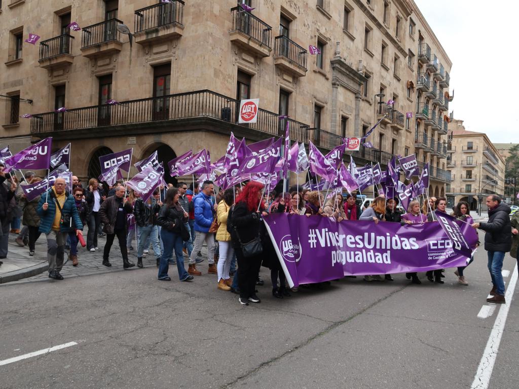 Así, en la Gran Vía UGT y CCOO de Salamanca escenificaron su firme compromiso con la igualdad real y efectiva entre mujeres y hombres, especialmente en el ámbito laboral. Es un objetivo prioritario e irrenunciable por el que desde los sindicatos se trabaja día a día con en todos los escenarios en los que están, especialmente en los centros de trabajo.