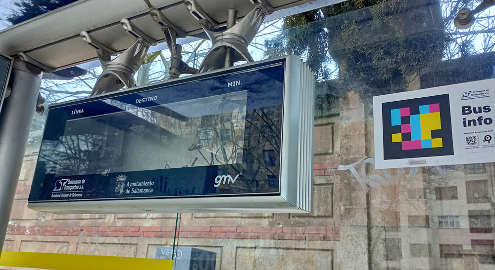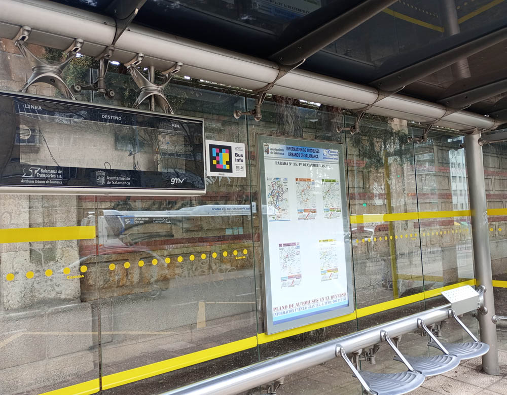 Es cierto que las marquesinas y postes del autobús urbano de Salamanca cuentan desde hace unos meses con un código QR que facilita los tiempos de llegada a través de la aplicación NaviLens, pero estas pegatinas no son accesibles para gran parte de los usuarios. Ello se debe a su elevada ubicación, que no está adaptada para viajeros con silla de ruedas, movilidad reducida y gran parte de mayores pues, en el caso de los postes, se encuentran a más de 2 metros de altura.