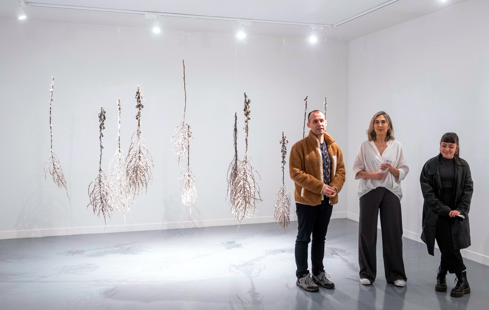Almudena S. Mata, Alba Prado y Alba Miguel, tres estudiantes de la Facultad de Bellas Artes de la Universidad de Salamanca, ahondan en el concepto del nido en la nueva exposición de la Salaseis. En la inauguración han estado acompañadas por la decana del centro, María Reina Salas; el vicedecano de Infraestructuras y extensión cultural, Diego del Pozo; y los profesores, Antonio Navarro y Raquel Puerta.