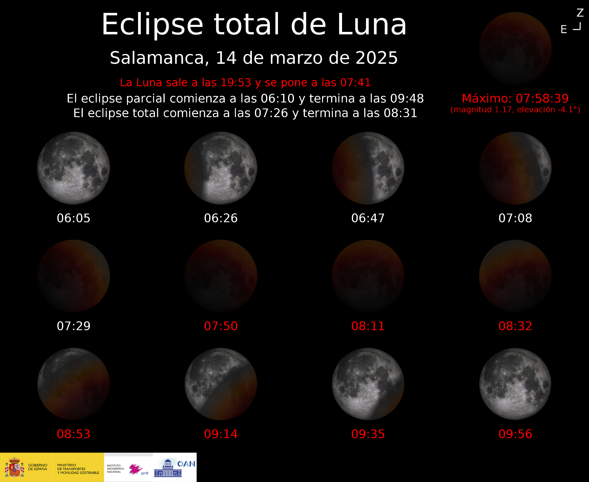 En Salamanca, la luna saldrá a las 19:53 y se pondrá a las 7:41 horas. El eclipse parcial comenzará a las 6:10 horas y terminará a las 9:48. Asimismo, el que cubrirá del todo la luna, es decir, el total, se registrará desde las 7:26 a las 8:31 horas, según los datos de la OAN.