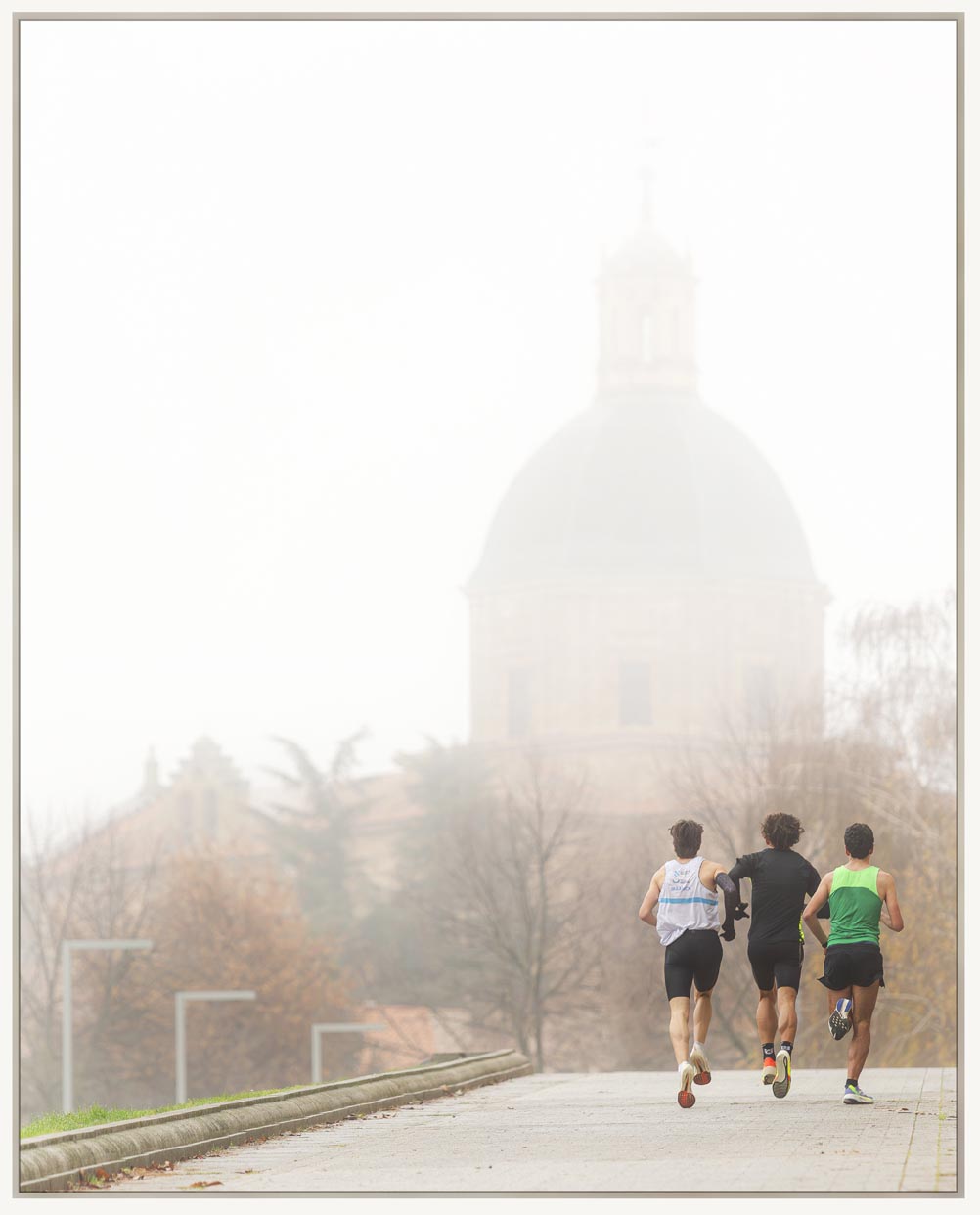 El obra titulada ‘Unidos por la zancada 2’, de David Martín Pinto, ha obtenido el primer premio del XXX Concurso Fotográfico ‘San Silvestre salmantina’. La imagen muestra a tres corredores que tomaron parte en la prueba, celebrada el 29 de diciembre, con parte de la zona monumental al fondo.