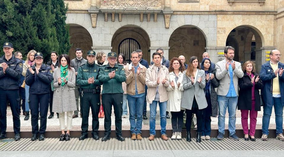 Autoridades políticas y policiales guardaron este viernes un minuto de silencio en la Subdelegación del Gobierno en Salamanca en repulsa de la violencia machista y del último caso de asesinato por violencia de género confirmado, en Las Palmas el pasado 31 de marzo.