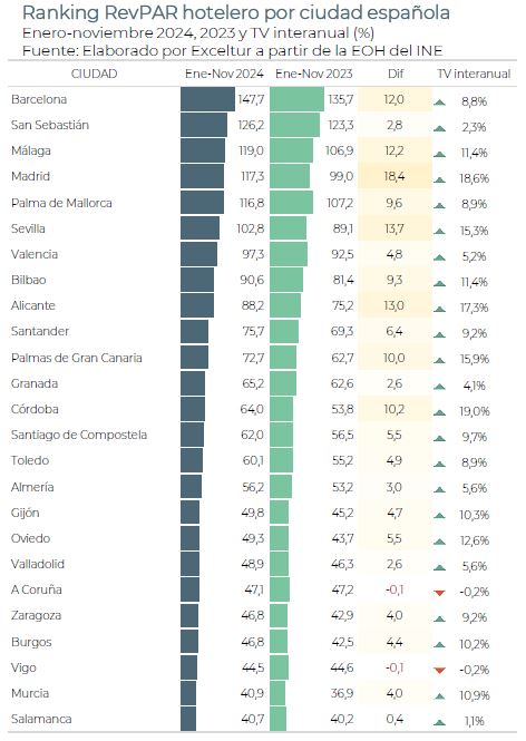 Barcelona se mantiene al cierre de 2024 líder de las ciudades españolas con 147,7€, de ingresos por habitación disponible, seguida de San Sebastián (126,2€), Málaga (119€), Palma (116,8€), Madrid (117,3€), Sevilla (102,8€) y Valencia (97,3€). Salamanca cierra la lista con 40,7 euros por habitación tras subir un 1,1 por ciento en 2024 (la tercera variación más desfavorable el estudio).