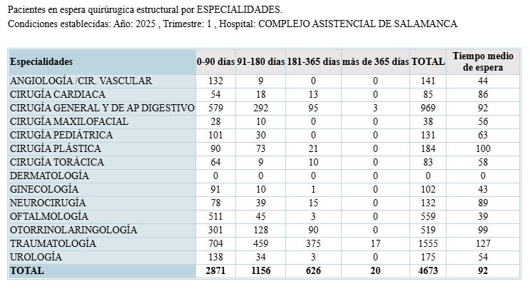 Salamanca contaba el pasado 31 de marzo con 172 pacientes prioridad uno (cuyo tratamiento quirúrgico, siendo programable, no admite una demora superior a 30 días), con una demora media de 12 días para operarse. Son 21 pacientes más y una demora media 3 días inferior a la del mismo trimestre de 2024.