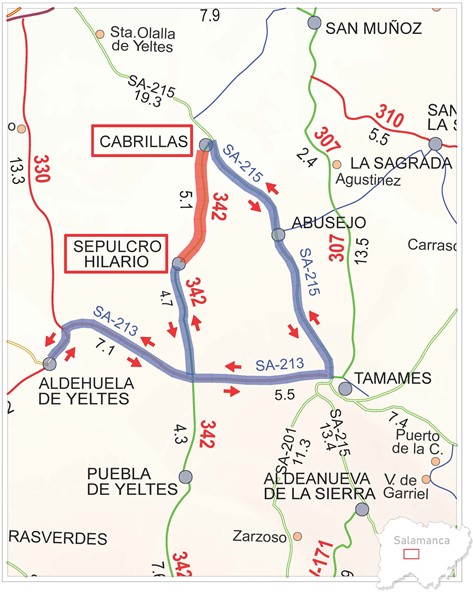 El tramo de la carretera DSA-342 comprendido entre Cabrillas y Sepulcro Hilario permanecerá cerrado al tráfico de vehículos desde el día 24 de abril desde la intersección de la DSA-342 con la carretera SA-215 a Sepulcro Hilario.