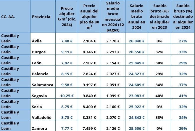 El orden de las provincias que dedican más sueldo al pago del alquiler por una vivienda de 80 metros cuadrados es: Segovia (41%), Salamanca (37%), Valladolid (34%), Burgos (33%), Soria (32%), Palencia (32%), Zamora (29%), León (29%) y Ávila (27%).