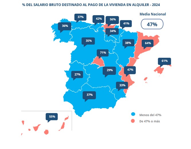 Viendo los datos en conjunto, el orden de las comunidades autónomas que dedican más dinero de sus sueldos a pagar el alquiler de una vivienda de 80 metros cuadrados es: Madrid (71% del sueldo bruto), Cataluña (64%), País Vasco (56%), Canarias (55%), Comunidad Valenciana (47%), Navarra (41%), Aragón (38%), Andalucía (37%), Asturias (37%), Galicia (36%), Castilla y León (35%), La Rioja (34%), Región de Murcia (33%), Castilla-La Mancha (29%) y Extremadura (27%).