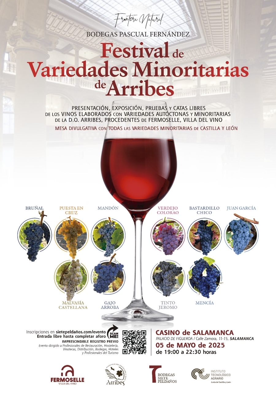 La segunda edición del ‘Festival de Variedades Minoritarias de Arribes’ reunirá a más de 400 profesionales del vino, turismo y hostelería en el Casino de Salamanca (Palacio de Figueroa). La jornada tendrá lugar el 5 de mayo, de 19:00 a 22:30 horas, y contará con la presencia de la Denominción de Origen (DO) Arribes y sus caldos elaborados en Salamanca y Zamora. La asistencia al evento es gratuita, previsa inscripción a través de la web de sietepeldaños.com.
