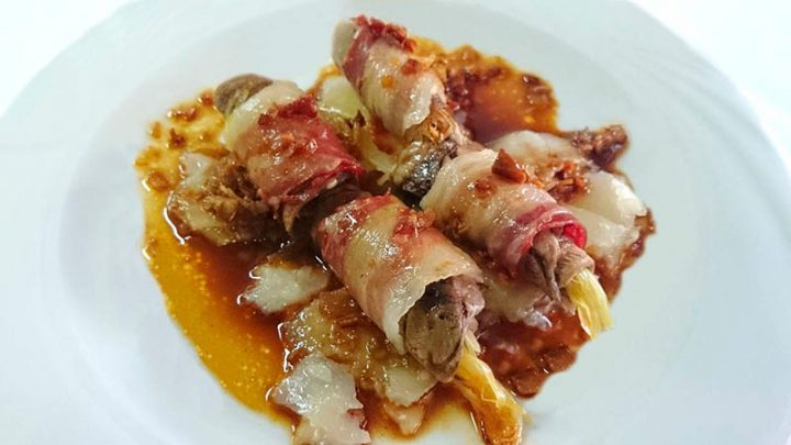 Por otro lado, montamos el Gyuntang disponiendo sobre una bandeja de horno lonchas de tocineta adobada, sobre ellas las filetes de lengua de ternera y repartimos las tiras de puerro confitadas en cada una de ellas. Las enrollamos y le agregamos una cucharada de aceite con la que hemos confitado el puerro y lo introducimos al horno unos diez minutos, justo antes de que las patatas concluyan su cocción y así, aprovecharemos el calor del horno.