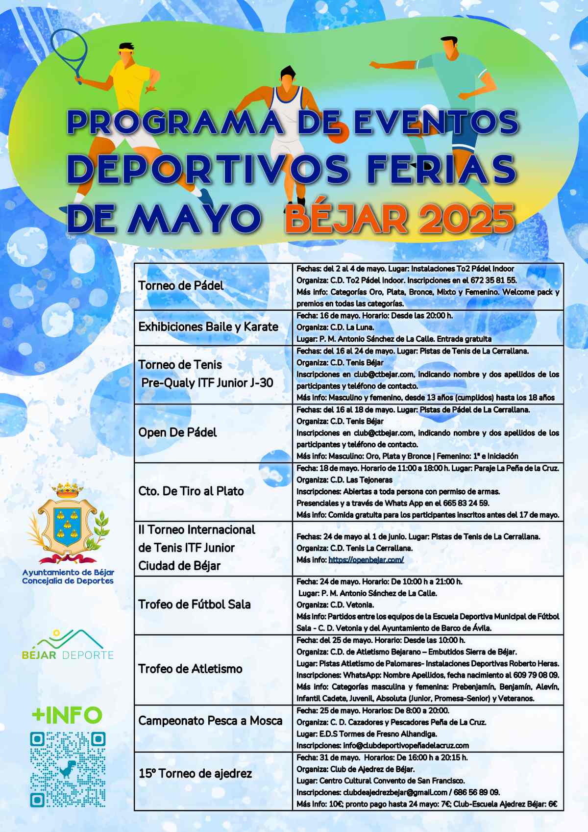 El programa de competiciones deportivas que se celebrará en Béjar con motivo de las Ferias de Mayo ya está listo. Incluye actividades de pádel, baile, karate, tenis, tiro al plato, fútbol sala, atletismo, pesca a mosca y ajedrez.