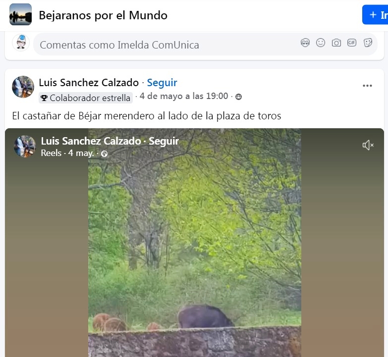 Facebook y sus grupos siguen siendo una forma de mantener lazos en barrios, pueblos y ciudades. Es el caso de ‘Bejaranos por el mundo’, un espacio utilizado tanto por vecinos de la localidad como por ‘bejaranos ausentes’, que comparten actualidad, curiosidades recuerdos y, en esta ocasión, un vídeo de lo más llamativo: un jabalí con su camada de jabatos, que caminan con total tranquilidad por las inmediaciones de la plaza de toros ‘La ancianita’, en El Castañar, cerca del merendero. Para unos son imágenes tiernas; para otros, peligrosas.